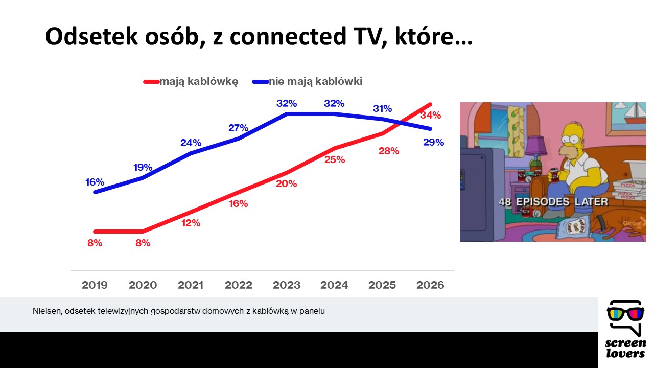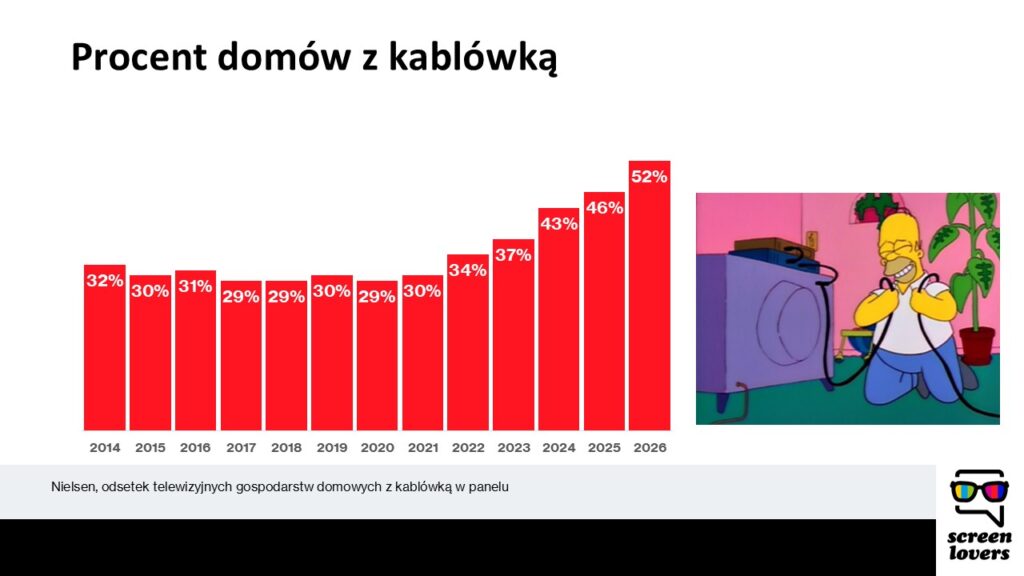 Te dwie krzywe to odsetki osób (tym razem nie gospodarstw domowych), które mają w domu connected TV podłączony do internetu. Przez lata CTV było domeną niekablowych domów. Albo kanały z kablówki, albo streaming i usługi “łapane” przez podłączony do internetu telewizor. Od pandemii – niezmiennie – odsetek gospodarstw kablowych z CTV rośnie. A nie-kablowych od 2023 roku nie tylko przestał rosnąć, ale wręcz spada. Wniosek – 5 lat temu Smart TV był substytutem dla usług płatnej telewizji. A dziś? Usługą komplementarną, szczególnie wobec dostarczanego z nią szybkiego internetu.