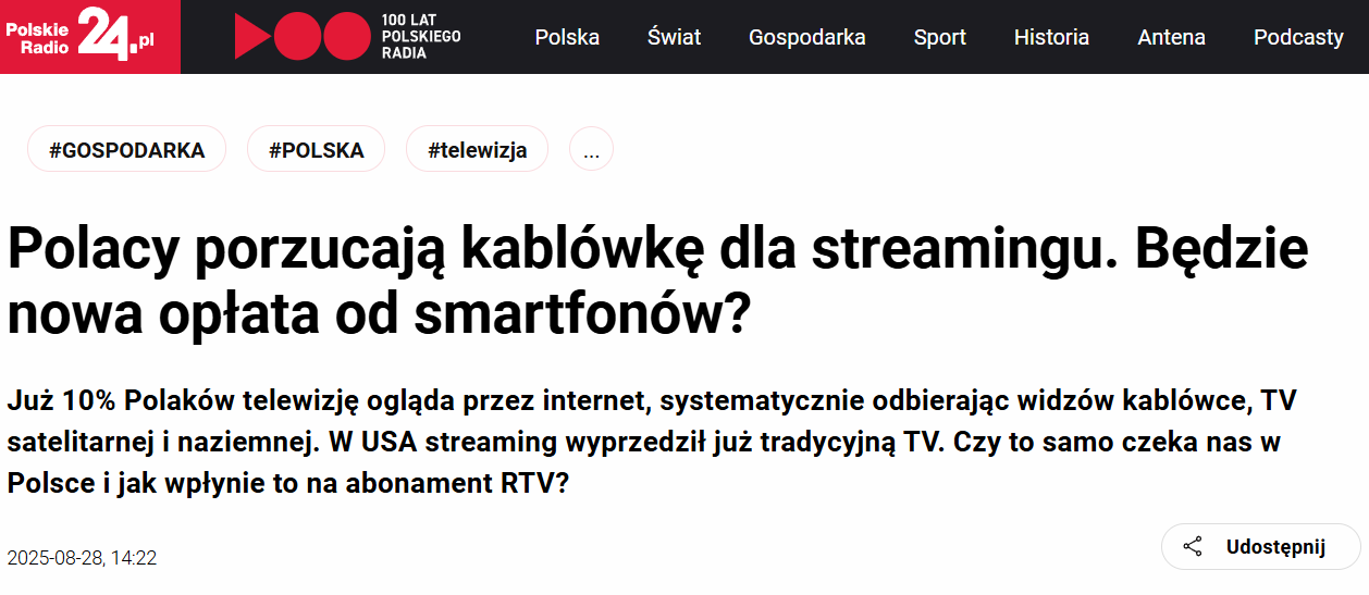 Niezależnie od danych, regularnie jesteśmy straszeni śmiercią kablówek. Choć statystyki z Polski przeczą tezie o porzucaniu kabla (i płatnej telewizji), zawsze znajdzie się globalny konsultant czy przeklejający newsy ze świata media-worker, który amerykański cord-cutting przeniesie nad Wisłę. Tylko w ub.r. czytaliśmy to: